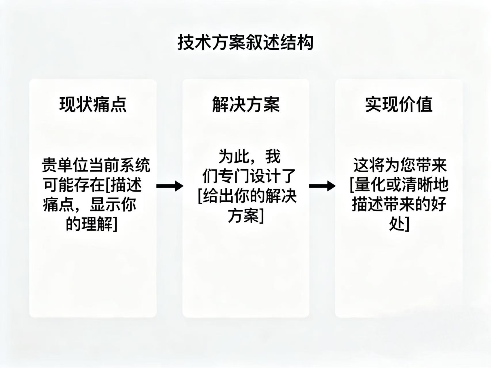 这是标书的灵魂,切忌写成产品说明书。建议采用 “现状痛点 → 解决方案 → 实现价值” 的叙述结构。