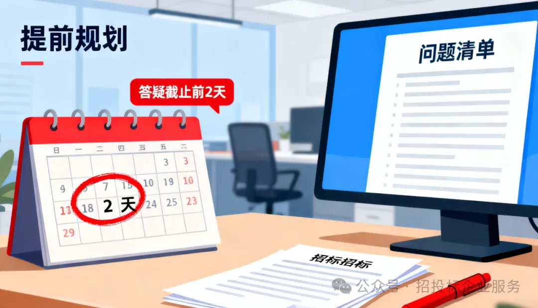✅ 第一个:答疑截止前 3 天(用来梳理问题,比如 “条款 3.1 的资质要求”“条款 6.2 的报价方式”,列成清单);