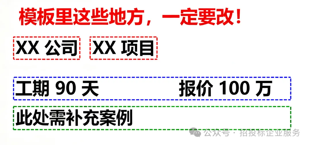拿到模板后,先把所有 “数据类内容” 标红:工期、报价、人数、质保期、设备数量、资质等级…… 然后拿出招标书,一条一条对着改: