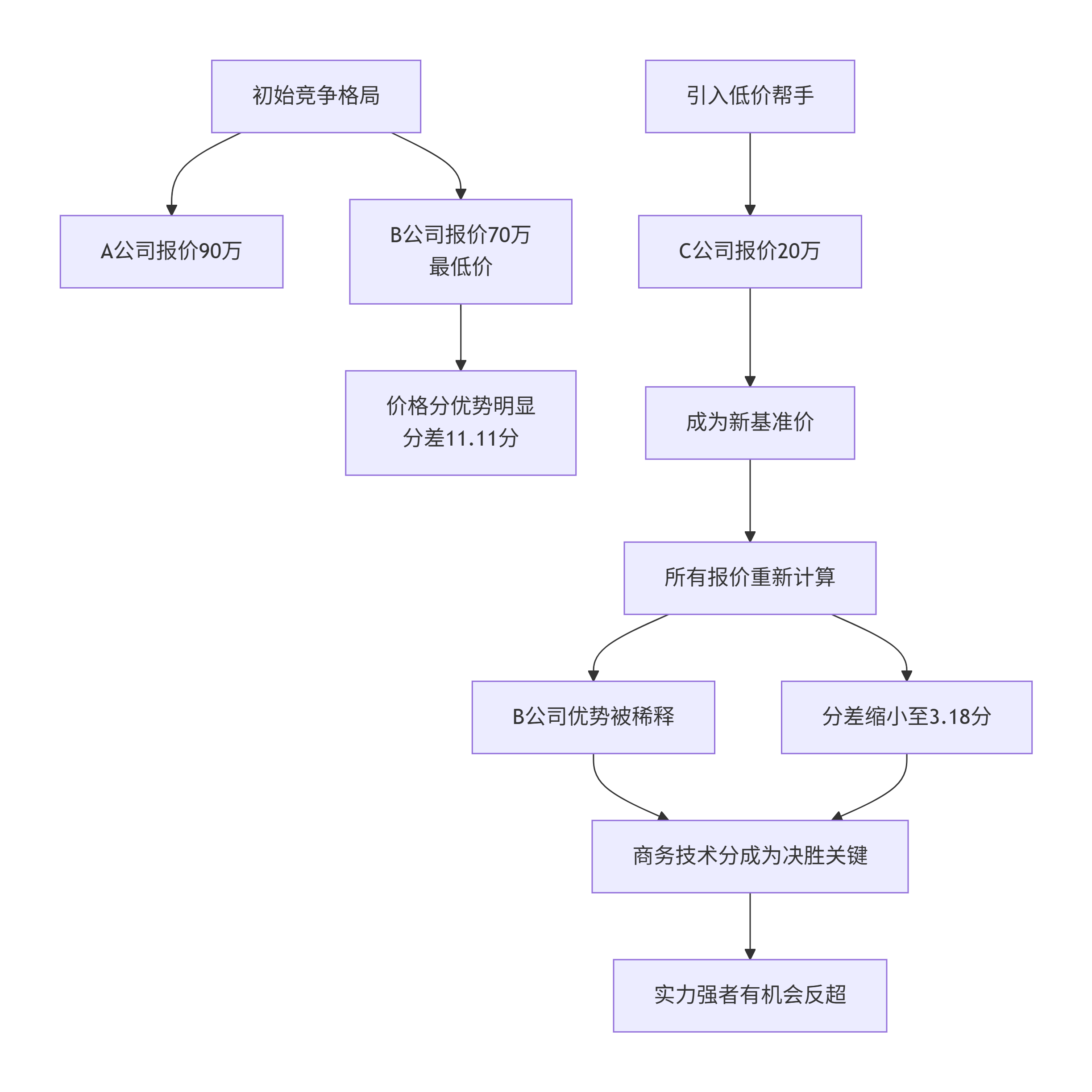 在竞争激烈的项目中,超过10分的分差很难通过商务技术分弥补,这几乎决定了B公司的中标优势。