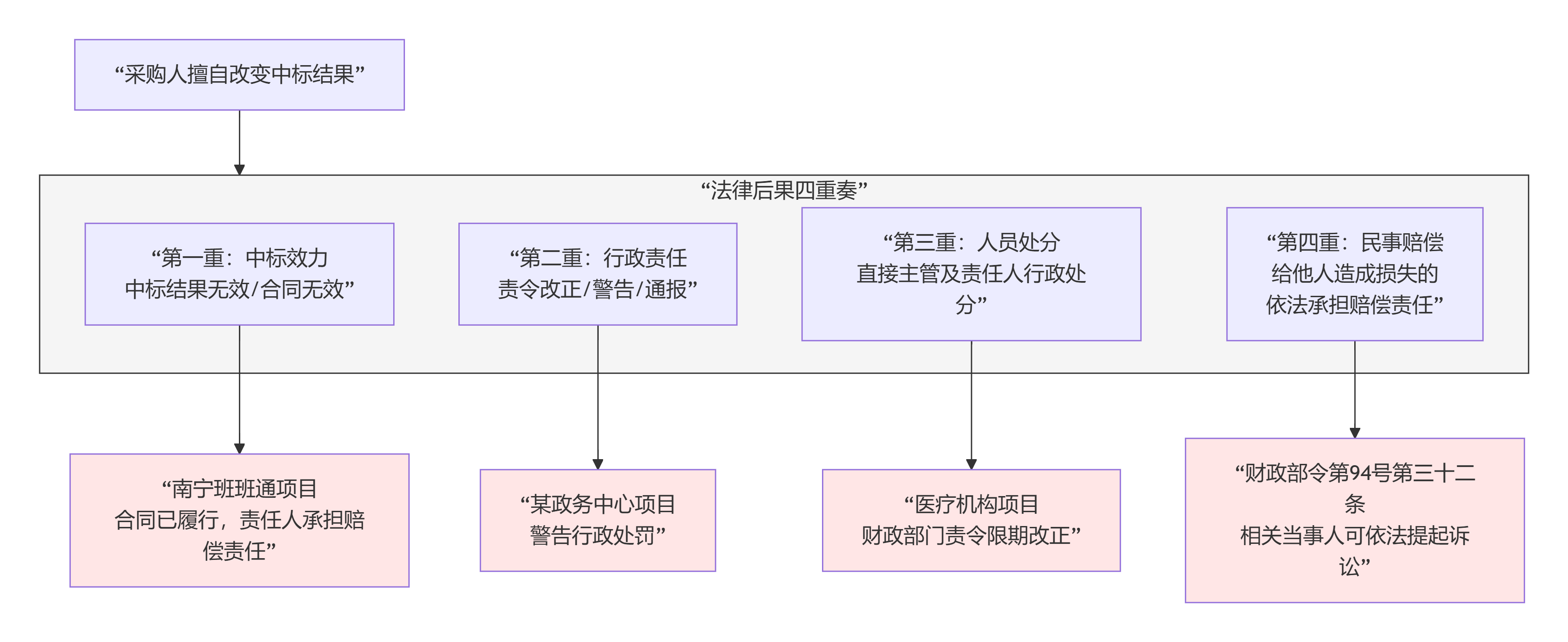 下图完整呈现了采购人擅自改变中标结果可能面临的四种法律后果: